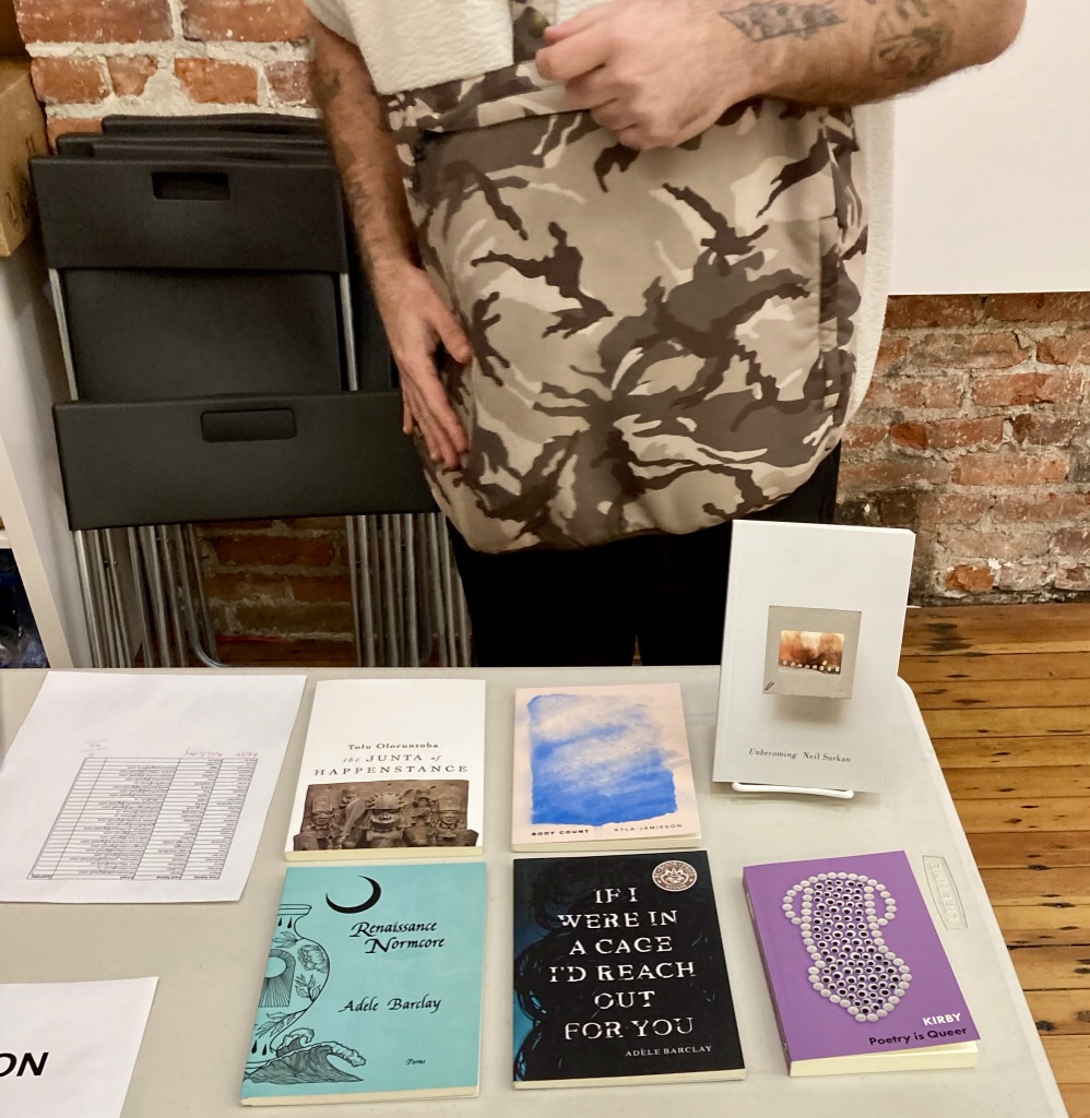 A full house at the wonderful Massy Arts Space, w/an extraordinary line-up, KYLA JAMIESON, TOLU OLORUNTOBA, ADÈLE BARCLAY, [myself], to celebrate the launch of dear friend/poet NEIL SURKAN’s newest from McGill-Queens UP, Unbecoming. A joyous exchange. Thrilled at the good fortune to have been able to go, support. Thanks to all who came (and bought books!). Special thanks to Neil, Stephen Collis, Lucas Crawford, & Tolu for reaching out, spending time, showing me the sights. Good company.