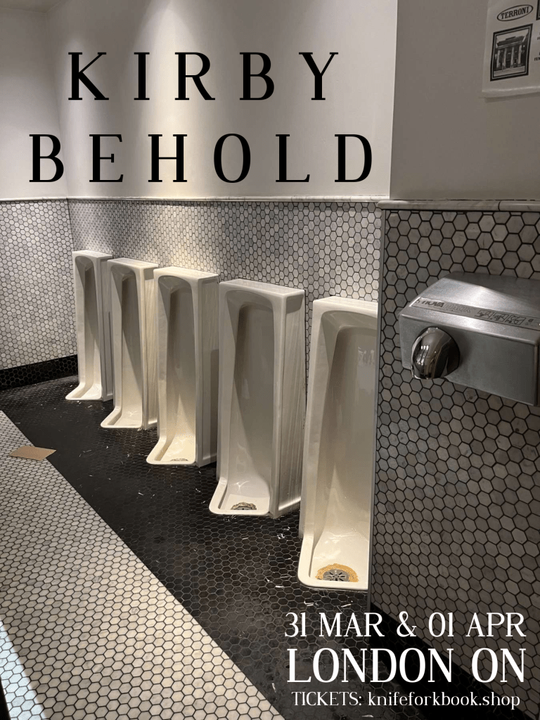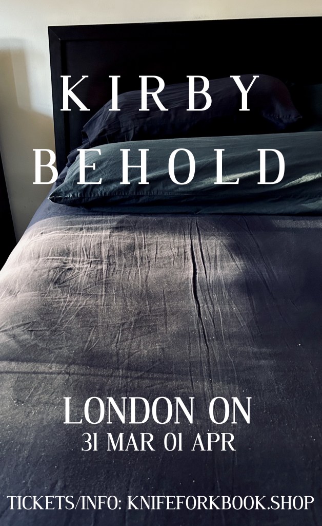 LOCAL ARTIST/FRIEND ANDRÉS GARZON has graciously invited me and is hosting two nights of BEHOLD [31 March & 01 April 7pm] in an intimate downtown London living room setting with an audience of twelve each night. TICKETS are going fast and can be purchased online at knifeforkbook.shop