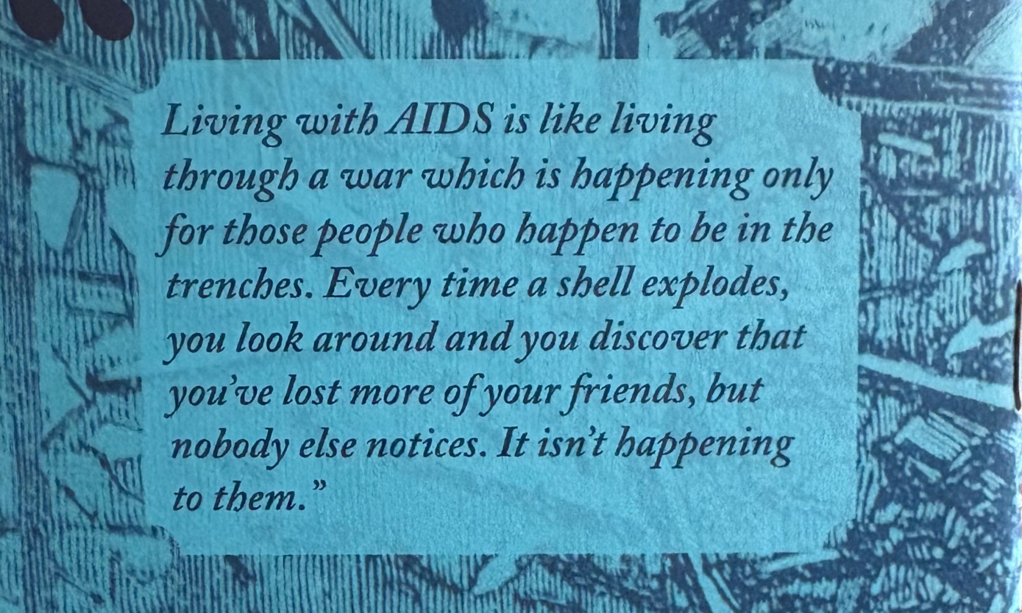 “If I’m dying from anything, I’m dying from the fact that not not enough rich, white, heterosexual men have gotten AIDS for anybody to give a shit.”*