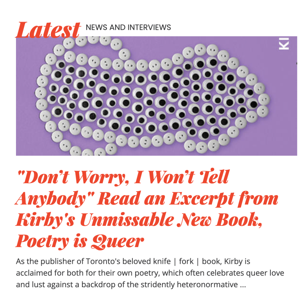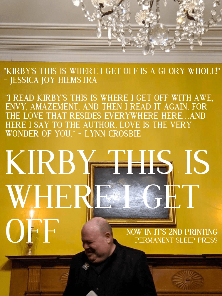 Follow KIRBY on Instagram and Twitter@itsakirby to meet them at various locations/settings, buddy booths, park benches, stairwells, nooks and cranies throughout Montreal’s “boyville.” Both one-on-one and open public readings. Live. Copies of THIS IS WHERE I GET OFF will be available to purchase (signed, w/photograph).