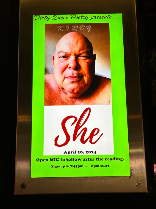 FIRST PUBLIC APPEARANCE in support of “she” April 10 8pm The Legendary Dirty Queer Poetry Series Hosted by Patricia Wilson & David Bateman at The Black Eagle