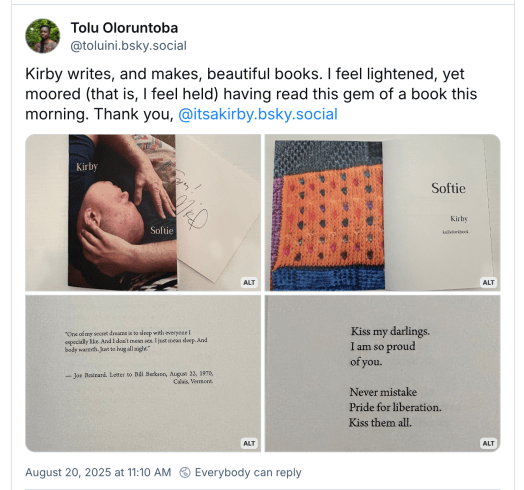 So much to admire in Kirby's #PIQ, but I'll just pick out one theme: the warm-hearted, embracing, contagious optimism. She never slaps your hand away; she draws it closer instead. It might be a book for the Ages, but what…https://t.co/zSNUyINSRu