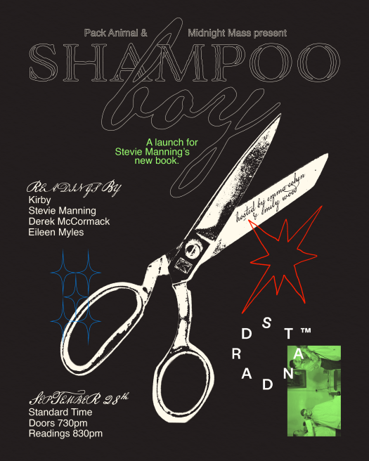 28 SEPT TORONTO STANDARD TIME in support of STEVIE MANNING’S SHAMPOO BOY LAUNCH w/DEREK McCORMACK & EILEEN MYLES