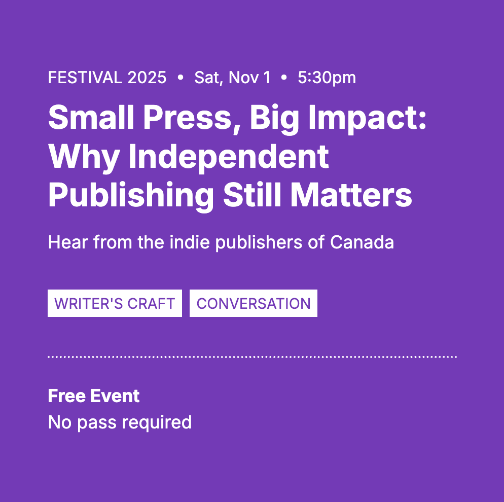 01 NOVEMBER 5:30PM VICTORIA COLLEGE UofT TIFA SMALL PRESS FAIR Panel “Small Press, Big Impact: Why Independent Publishing Still Matters” w/Kate Siklosi & Dani Spinosa (Gap Riot Press) Leigh Nash (Assembly Press) Kirby (knife | fork | book)
