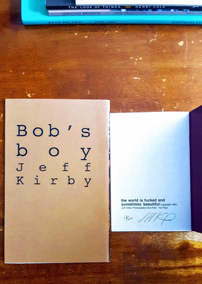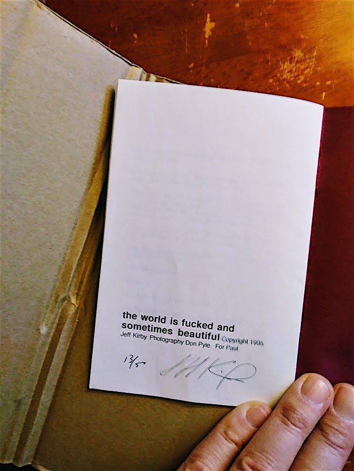 Never thought I would see, let alone hold, a copy of this very limited edition (no.13 of 50) early chapbook of mine, the world is fucked and sometimes beautiful (self-published 1995), but there it was, ‘signed by Kirby!’ online in Pittsburgh. Good news, a number of these will be included in my first full-length, This Is Where I Get Off (Permanent Sleep Press, 22/04/2019).
